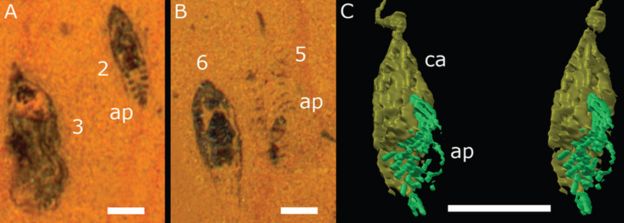 К его спине было "привязано" с десяток капсул, в которых, по всей видимости, содержалось неполовозрелое потомство, причём на разных стадиях развития. Несмотря на такую гиперопеку, существо без глаз, с множеством ног и длиной в сантиметр не оставило живущих ныне потомков.