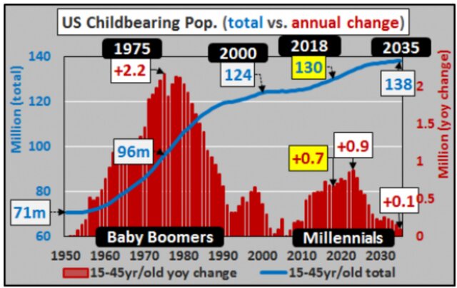 Красные столбцы – это ежегодные изменения, а синяя линия - это общее население от 15 до 45 лет. Рост когорты населения детородного возраста, представленной "бэби-бумерами" слева, затмевает рост "миллениалов" справа.