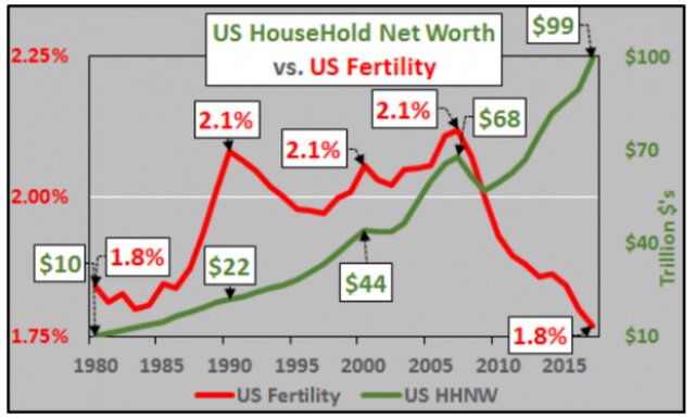 В нижеприведенной таблице показан быстро падающий коэффициент рождаемости в США по сравнению с рекордным показателем чистой стоимости домохозяйств. Во время предыдущих пиков показателей чистой стоимости домохозяйств был отмечен соответствующий рост в коэффициенте рождаемости, но не в этот раз.