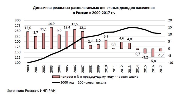 Если не учитывать рост доходов год к году в 2 отдельных месяца (декабрь 2015 г. и январь 2017 г.), то с ноября 2014 г. по декабрь 2017 г., то есть на протяжении 38 месяцев, реальные располагаемые доходы год к году падали. Таким образом, за 2014-2017 гг. реальные доходы населения упали на 11,0% и откатились до уровня 2009-2010 гг.
