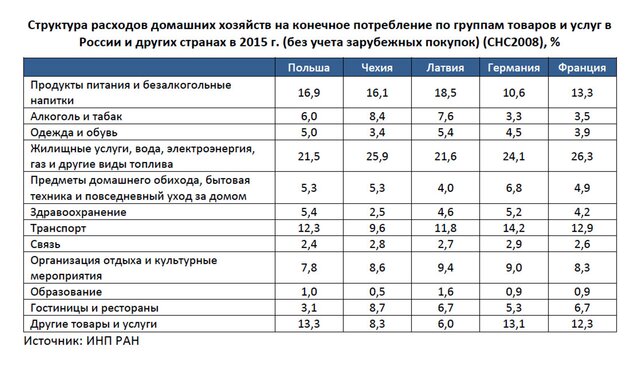 Структура потребления российских домашних хозяйств имеет ряд отличительных особенностей. Во-первых, для нас характерна крайне высокая доля расходов на категорию "Продукты питания и безалкогольные напитки". В России этот показатель значительно превосходит аналогичную долю расходов в странах со схожим уровнем доходов, не говоря уже о наиболее экономически развитых странах. В 2004-2013 гг. в нашей стране доля расходов на продукты и безалкогольные напитки составила 27%-30%, а, например, в Польше, Чехии и Латвии (в 2015 г.) – 16%-19%.