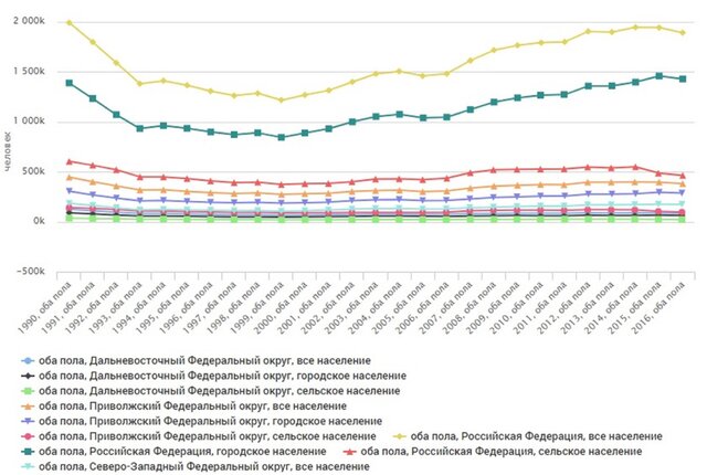В 2017 г. выросла регистрация браков на 63,891 тыс., или на 6,5%, до 1,05 млн. Число разводов выросло на 3,1 тыс., или на 0,5%, до 611,4 расторжений брака. Рождаемость упала во всех регионах, но наименьшие темпы снижения рождаемости – снижение до 1 тыс. - в Ненецком округе и Костромской, Мурманской областях, Адыгеи, Калмыкии, Северной Осетии.