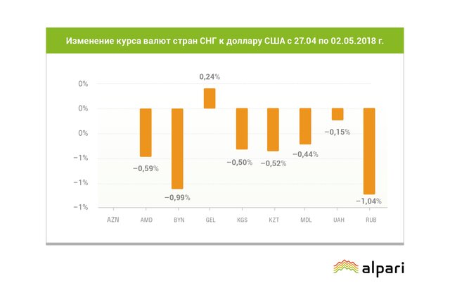 За неделю с 26 апреля по 3 мая валюты стран СНГ почти единогласно упали по отношению к доллару США. Аутсайдерами недели стали валюты стран Евразийского Союза (ЕАЭС), прежде всего, российский рубль (-1,04%) и белорусский рубль (-0,99%), что неудивительно.