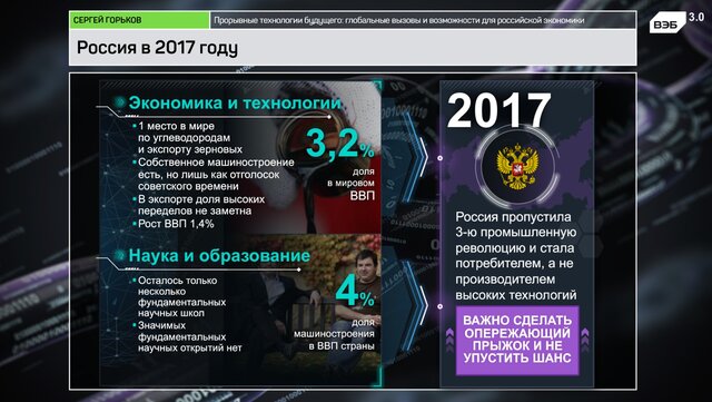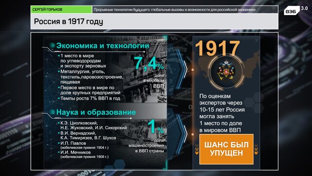Горьков отметил – в последующие годы страна эксплуатирует наследие великого прошлого, наука развивается слабо, современные фундаментальные открытия отечественных ученых не развиваются, низка доля экспорта технологий, машиностроение базируется на советском оборудовании. Эксперты сходятся во мнении – не случись трагических октябрьских событий 1917 г., страна через 10-15 лет могла занять 1-е место по доле в мировом ВВП. В 2017 г. Россия пропустила 3-ю промышленную революцию и стала потребителем, а не производителем технологий. Экономике страны брошен реальный вызов, инновации непрерывно создаются, но оставляет желать лучшего скорость внедрения. Сейчас перед страной стоят глобальные вызовы для экономики. Прорывные технологии ежедневно становятся реальностью.
