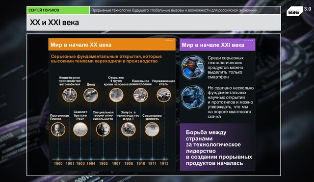 Дискурс начался с погружения в факты основных революционных событий, послуживших основой для технологического скачка в XX - XXI веке. Для многих слушателей было открытием, что наибольшая динамика изменений наблюдалась не в наши дни, а в первые годы прошлого столетия. Тогда открытия быстро внедрялись в производство. Знаковое время больших перемен послужило отправной точкой для технологической гонки между странами. Фундаментальные открытия дали дополнительный импульс конкуренции мировых лидеров в сфере высоких технологий.