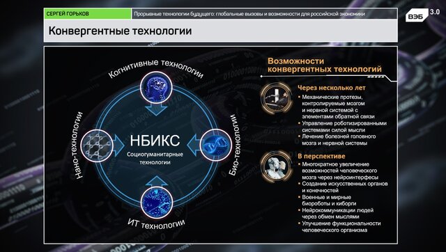 Наша задача как института развития — построение цифровой платформы экономики России будущего, ключевыми элементами которой будут прорывные технологии. Для нас это блокчейн, квантовые и конвергентные технологии. Скорость их внедрения — ключевое условие сохранения лидирующих позиций России в построении цифровой экономики будущего.Искусственный интеллект это часть большой конвергентной сферы, куда входят когнитивные технологии, нанотехнологии, биотехнологии, IT. На основе конвергентных технологий уже создаются нейроинтерфейсы "человек - машина и киберфизические системы. К настоящему времени достигнуты результаты по лечению ранее неизлечимых болезней (борьба с параличом, восстановление после инсульта, управляемые силой мысли протезы). Среди значимых проектов в этой отрасли "Нейронное кружево", охватывающее большое количество нейронов (проект Илона Маска); датчики, имплантируемые в кору головного мозга для передачи данных (проект DARPA); картографирование человеческого мозга (проект Евросоюза), создание имплантируемых пакетов (проект DARPA).