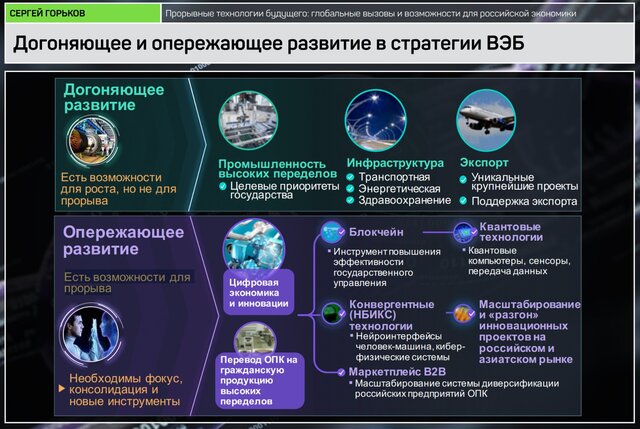 ВЭБ принял стратегическое решение двигаться сразу по двум направлениям развития, обозначив их как догоняющее и опережающее. На долю первого приходится рост развития инфраструктуры, второго – прорыв в области высоких разработок на блокчейн, квантовых технологиях, создания ИИ, внедрение перспективных разработок в рамках концепции b2b.