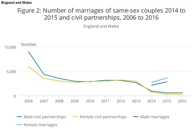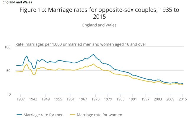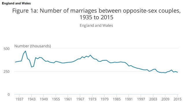 Опубликованные ведомством графики демонстрируют сокращение показателя в последние годы до наиболее низких уровней с 1930-х годов. Однако при этом в ONS отметили, что по состоянию на конец 2015 г. уровень традиционных браков в Британии упал до своего наиболее низкого значения с 1862 г.