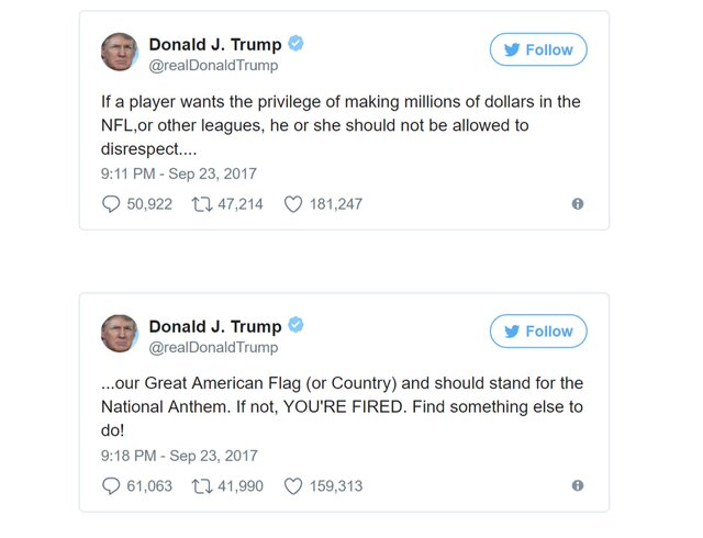 Трамп достаточно активно и жестко выразил свое недовольство поведение игроков NFL. В Алабаме он сказал, что эти "сукины дети" демонстрируют "тотальное уважение ко всему, что нам дорого". Также он уверен в необходимости увольнения таких игроков.