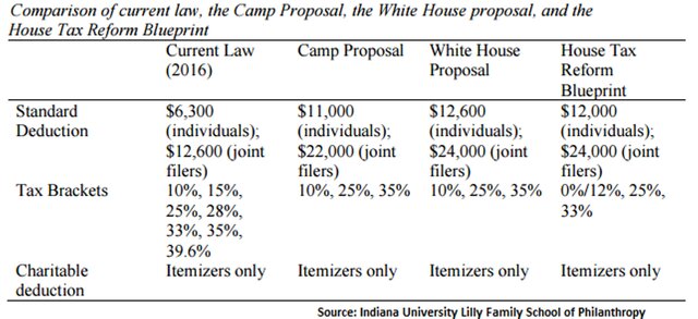 Удвоение стандартных вычетов и сокращение верхней ставки налога до 35% с почти 40%, уменьшило бы объем пожертвований до $13 млрд в год, согласно новому исследованию, проведенным Indiana University Lilly Family School of Philanthropy. Анализ был заказан Independent Sector, который представляет собой коалицию некоммерческих организаций, фондов и программ по корпоративной благотворительности.