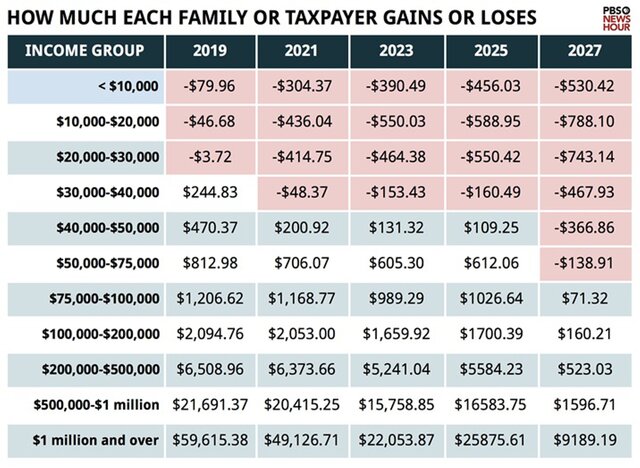 Новые оценки того, сколько могут в действительности "сохранить" американцы благодаря налоговой реформе, также ставят под сомнение достоверность таких прогнозов. В конце ноября 2017 г., американский телеканал PBS Newshour опубликовал оценки влияния налоговой реформы на различные группы американцев, в зависимости от их доходов на основе доклада (PDF) Управления Конгресса США по бюджету (CBO).