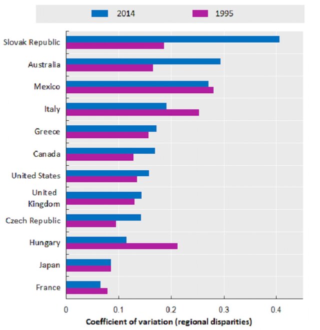 В отчете OECD Regions at a Glance 2016 отмечается, что большинство стран снижают уровень неравенства между регионами по таким параметрам, как образование и доступ к интернету, однако неравенство по таким параметрам, как ВВП на душу населения, чистый доход, безопасность и качество жизни, растет во многих странах. Уровень неравенства чистого дохода на душу населения между самыми богатыми и самыми бедными регионами в странах ОЭСР рос на 1,5% в год в среднем за период с 2000 по 2013 года. При этом, самый высокий уровень роста наблюдался в таких странах, как Словакия, Австралия, Чехия и Канада.