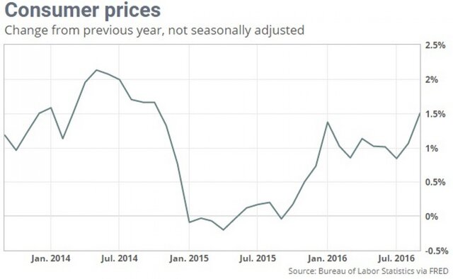 Потребительские цены (индекс CPI) в США в сентябре 2016 г. выросли на 1,5% в годовом выражении, что стало максимальным повышением с октября 2014 года, свидетельствуют данные министерства труда страны.