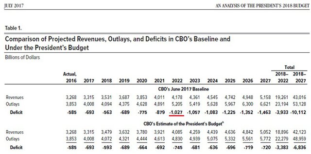 Данные оценки были опубликованы в прогнозе федерального агентства (CBO) по бюджету и экономике США. Стоит отметить, что речь идет о базовом прогнозе CBO, а не прогнозах бюджета администрации Трампа. При этом в ведомстве отметили, что планы Дональда Трампа не приведут к сокращению дефицита бюджета США, вопреки его заверениям.