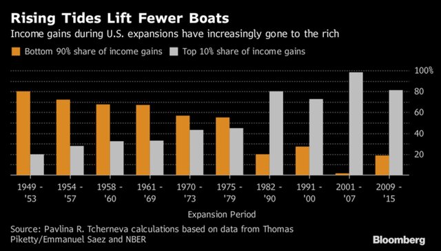 По данным опроса ФРС по потребительским финансам, рост рынка помог 1% американцев увеличить долю национального богатства, которой он владеют, до 39% в 2016 году. В 1989 году 90% семей имели одну треть благосостояния, теперь это число сократилось до менее чем одной четверти.