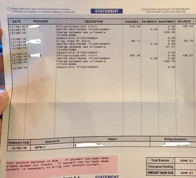 Еще пример: играя в баскетбол за школьную команду, ребёнок получил травму. Ортопед сделал снимок колена: ничего серьёзного не выявили, выдали наколенник, сказали прикладывать лёд, не двигаться. Колено продолжало болеть, опухоль не спала - в итоге, сделали МРТ. Через месяц пришёл счёт: $ 240 за осмотр ортопеда, $170за рентген колена, $1200 за МРТ колена и, наконец, $40 за наколенник!