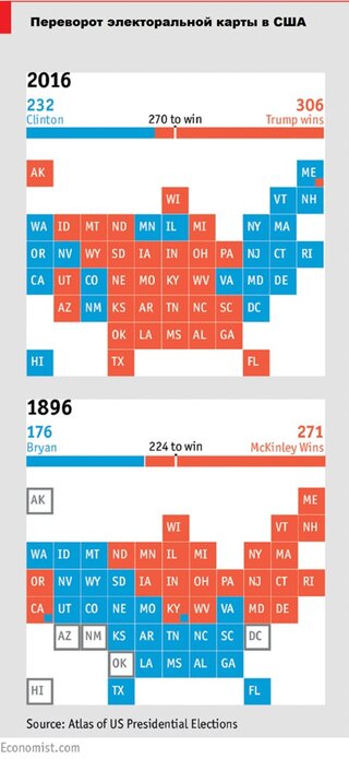 Если сравнить их электоральные карты, то Брайан, несмотря на общий проигрыш, одержал победу в тех же штатах, что и Трамп в прошлом ноябре. Удивительно, но электоральная карта развернулась на 180 градусов с 1896 г., и традиционно республиканские штаты превратились в демократические и наоборот, отмечает британский журнал The Economist.