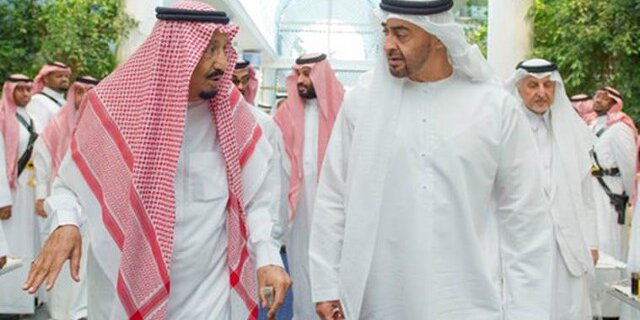 Король Саудовской Аравии Салман бен Абдель Азиз Аль Сауд (слева) разговаривает с крон-принцем Абу-Даби Мухаммадом бен Зайд Аль Нахайян