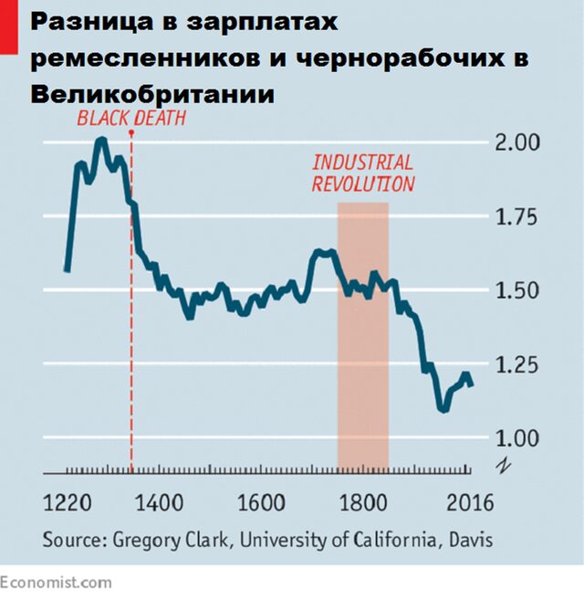 Авторы другого исследования обнаружили, что доля неквалифицированных рабочих в Англии увеличилась с 20% трудовых ресурсов в 1700 г. до 39% в 1850 г. Коэффициент зарплат квалифицированных работников к зарплатам простых рабочих стал уменьшаться в начале 1800-х гг. и не восстановился до 1960 г., отмечает британский журнал The Economist.