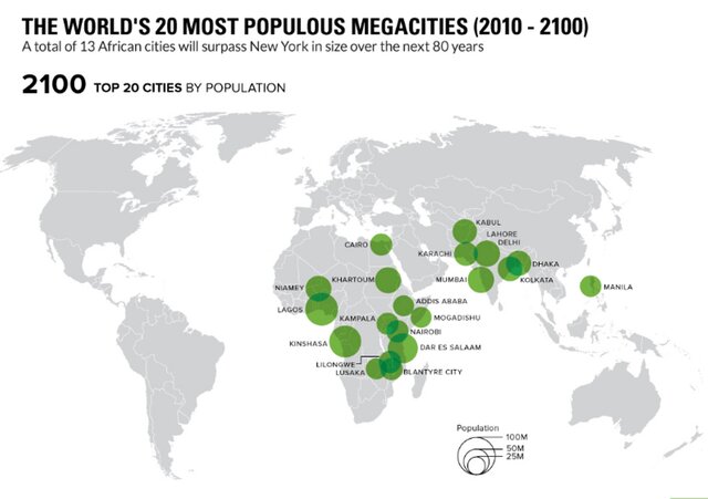 В течение следующих 80 лет некоторые города вырастут в 10, а то и в 20 раз, превращаясь в города-гиганты, сравнимые по численности населения с целыми странами, такими как современная Германия, Франция или Великобритания.