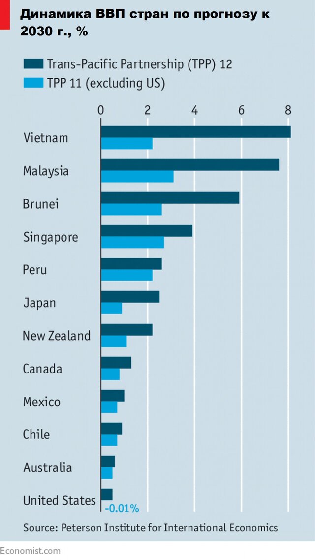 Между тем, японцы стремятся создать мотиваторы, которые бы заставили Америку присоединиться к ВПТТП в будущем, отмечает британский журнал The Economist.