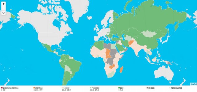 Однако во многих странах по-прежнему высокие уровни голода, как можно увидеть на карте 2015 Global Hunger Index.