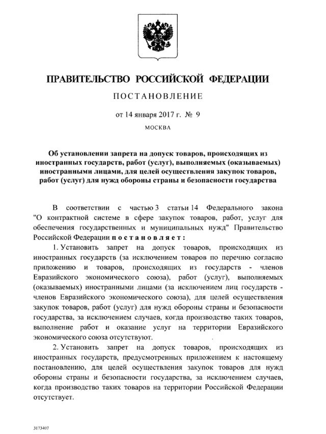 Правительство России постановило запретить государственные закупки иностранных товаров для оборонного сектора страны при наличии отечественных аналогов.