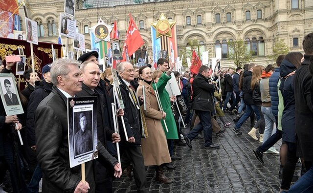 В рядах "Бессмертного полка" уже в третий раз прошагал президент России Владимир Путин. Рядом с главой государства шли актеры Василий Лановой и Михаил Ножкин."Бессмертный полк" в Москве собрал 850 тысяч участников https://t.co/g5CWF1KTIr