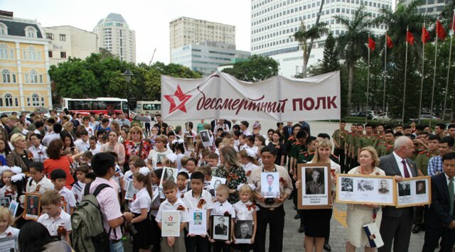 В акции "Бессмертный полк", которая впервые прошла в столице Вьетнама 4 мая, в преддверии Дня Великой Победы, участвовали более 400 человек.