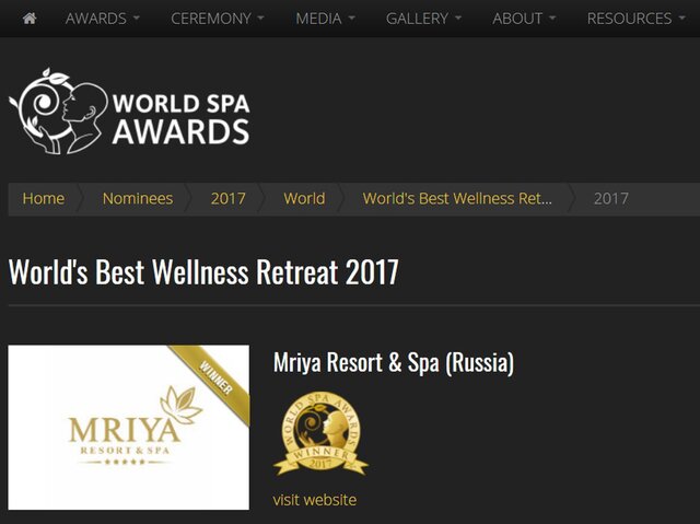 Отель Mriya Resort & Spa, расположенный в российском Крыму, победил в номинациях "Лучший в мире курортный комплекс 2017" (World∎s Leading Leisure Resort 2017) и "Лучший в Европе курортный комплекс 2017" (Europe's Leading Leisure Resort 2017).