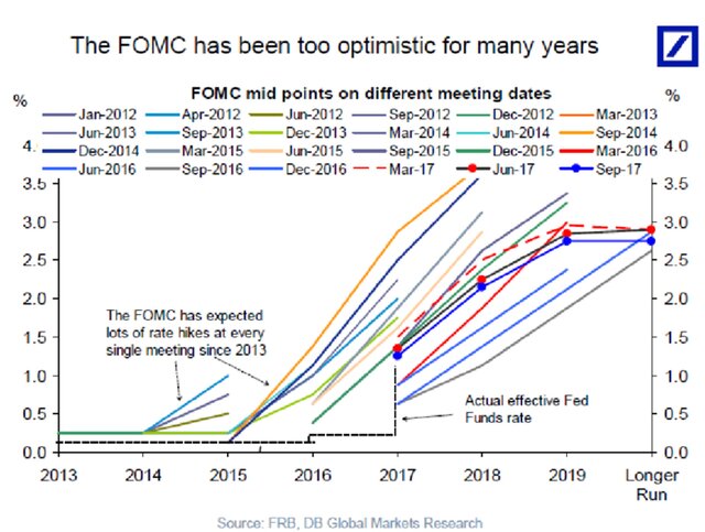 На протяжении 5 последних лет ФРС постоянно пыталась убедить инвесторов в том, что меры стимулирования экономики работают. Каждый раз их прогнозы оказывались сверхпозитивными и были далеки от реальности.
