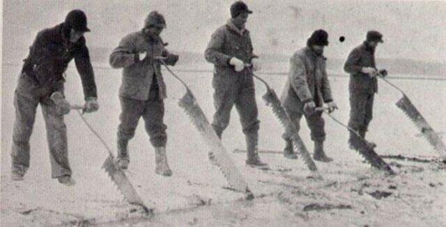 Когда не было холодильников и морозильных установок, а людям был нужен лет, то единственным способом получить его было отрезать кусок от большой глыбы.