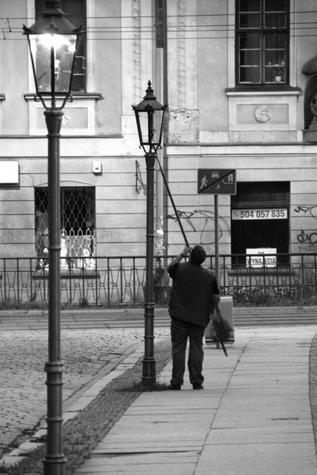 Это были люди, в основном мужчины, которые ходили по улицам города и зажигали фонари. Для этого они использовали длинные шесты или лестницы, на которые они взбирались. А по утрам они точно так же обходили город и тушили фонари, а также при необходимости дозаправляли их.