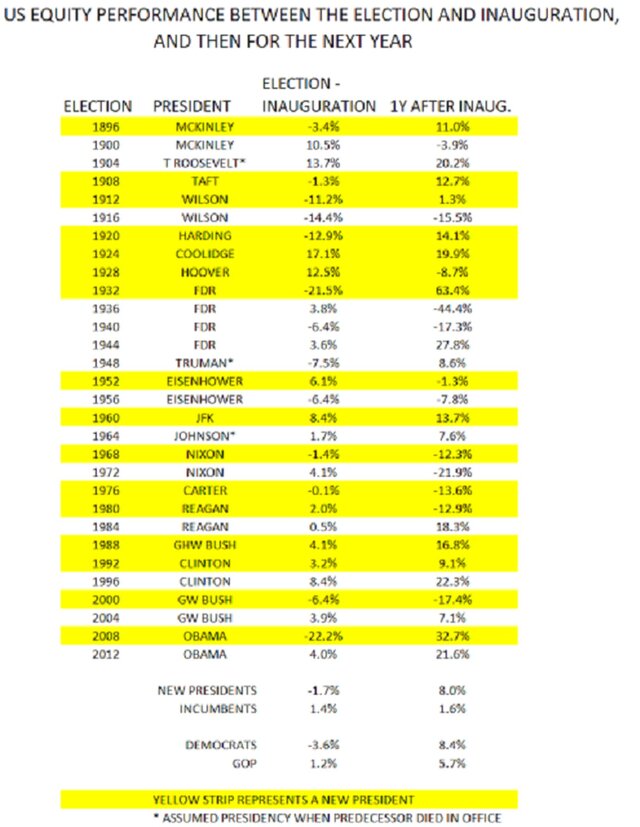 Было пять случаев, когда Dow подскочил по крайней мере, на 5% в пятинедельный период после президентских выборов. В течение следующих шести месяцев ралли происходило еще четыре раза из пяти, набирая в среднем 10%.