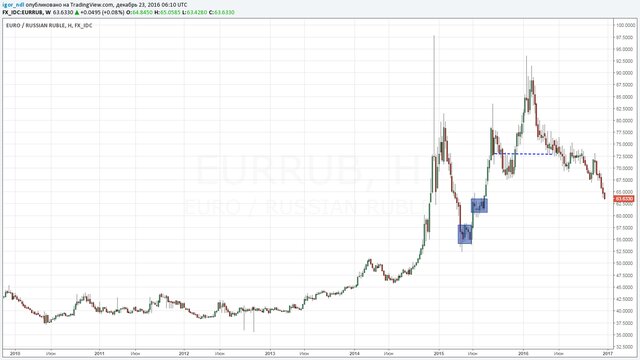 Рассмотрим график пары доллар/рубль, тем более что на нее на Московской бирже есть достаточно ликвидные фьючерсные контракты.