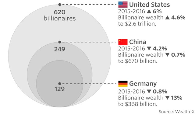 В 2016 году чуть меньше трех четвертей миллиардеров в мире испытали рост или падение их благосостояния на 5%. Каждый пятый столкнулся с колебанием более чем на 20%. Эти изменения во многом зависят от фондовых рынков в Европе и Азии, а также высоких показателей акций США в прошлом году.