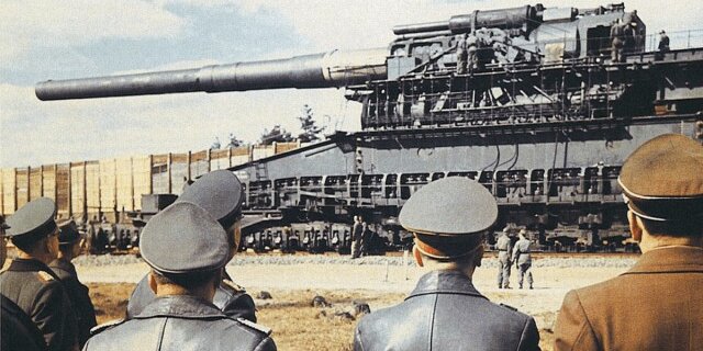 Gustav весом в 1350 тонн мог стрелять снарядами весом в 7 тонн на расстояние 47 км. Позднее орудие использовалось во время войны с СССР.
