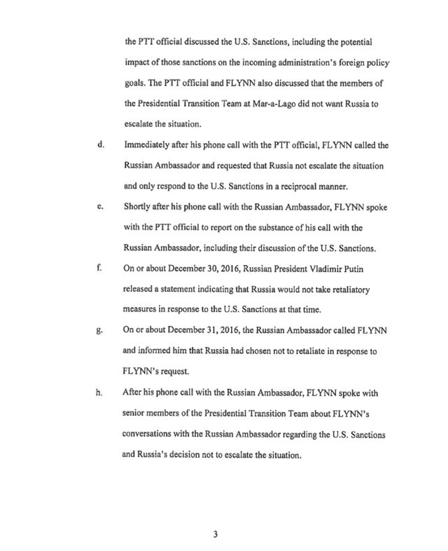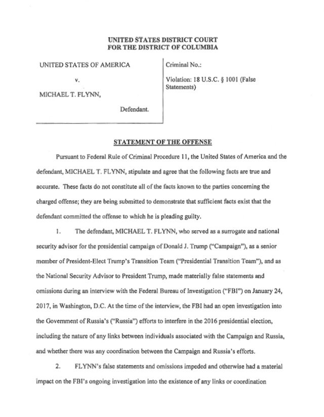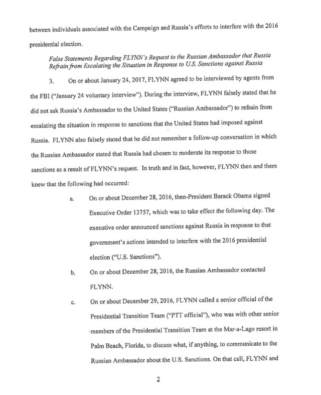 В опубликованном признании дачи ложных показаний (PDF) содержится признание в том, что Флинн солгал агентам ФБР по трем основным пунктам: