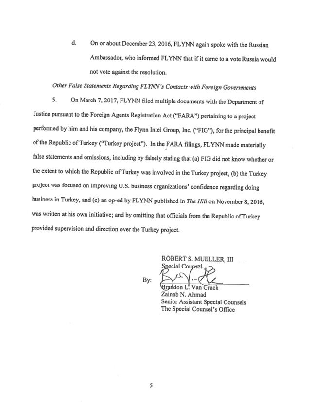 3. Третьим, и, возможно, наиболее серьезным нарушением стала дача ложных показаний ФБР по поводу продвижения Флинном интересов Турции. Экс-советник президента США не сообщил о том, что участвует в лоббировании интересов Турции, а также что он создал компанию Flynn Intel Group с целью лоббирования интересов Турции в США.
