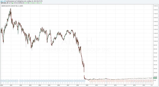 После обвала в 2008 г. акции страховщика так и остались "валяться на полу". Более того, сейчас капитализация AIG даже ниже балансовой стоимости. При расчете на акцию балансовая стоимость составляет $79,74, а на рынке бумаги стоят $62,76.