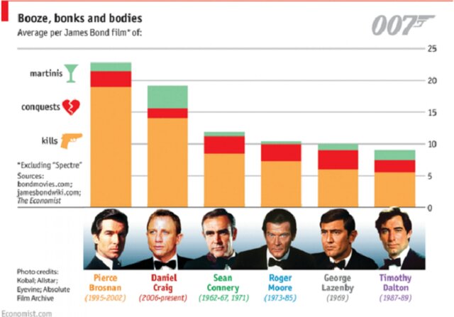 Однако в разных фильмах количество представленных брендов различно. Так, в "Умри, но не сейчас" (Die Another Day) с Пирсом Броснаном продюсеры сотрудничали с 21 брендами. А во время съемок "Казино Рояль" (Casino Royale) с Дэниэлом Крейгом – всего с семью.