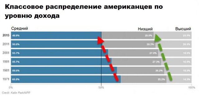 Согласно данным NPR, из-за неблагоприятных экономических факторов в США проживает 120,8 млн взрослых, относящихся к домохозяйствам со средним уровнем дохода. К высшему и низшему классам относятся 121,3 млн человек.