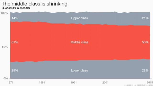 Американцы уже давно живут в стране, где число семей среднего класса составляет большинство. Но впервые в истории США доля среднего класса упала ниже 50%.
