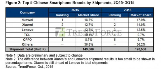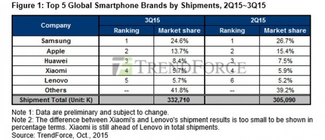 Xiaomi, еще один быстрорастущий китайский бренд, в квартальном рейтинге TrendForce разместился на четвертом месте с результатом 5,7%. С такой же долей финишировала и Lenovo, замкнувшая пятерку лидеров.