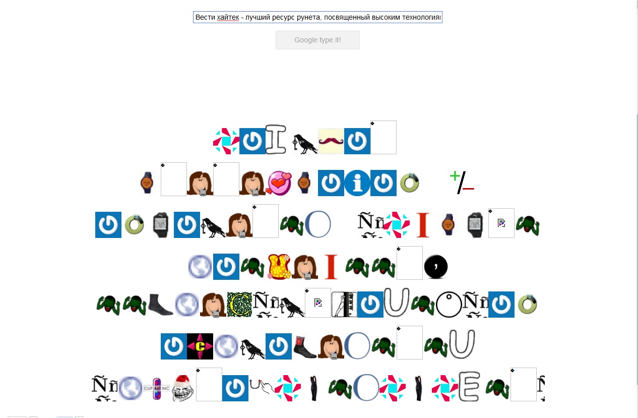 Вся система завязана на забавной особенности поисковой машины: если ввести любую букву, поисковик отыщет тысячи изображений, на которой она запечатлена. К примеру, если вбить в качестве запроса букву Y, Google выдаст не только картинки, где она по-разному нарисована, но и фотографию парня, изображающего этот символ руками, или, к примеру, несколько упавших листиков, сложившихся в форме буквы. Чтобы читать созданные Google Type тексты, придется привыкнуть к тому, что некоторые символы разобрать очень сложно, но в целом это не мешает пользоваться ресурсом.