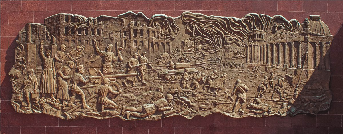 На вертикальной части здания с внешней стороны представлена ретроспектива батальных сцен, повествующих о ключевых эпизодах Великой Отечественной войны, начиная с Брестской крепости и заканчивая парадом Победы на Красной площади в Москве 24 июня 1945 года.