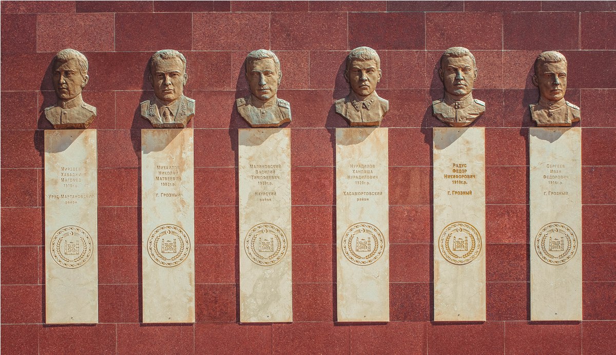 Здесь же размещены барельефы с именами сорока Героев Советского Союза - жителей Чеченской Республики, призванных в военный период в ряды Советской Армии с территории бывшей ЧИАССР.