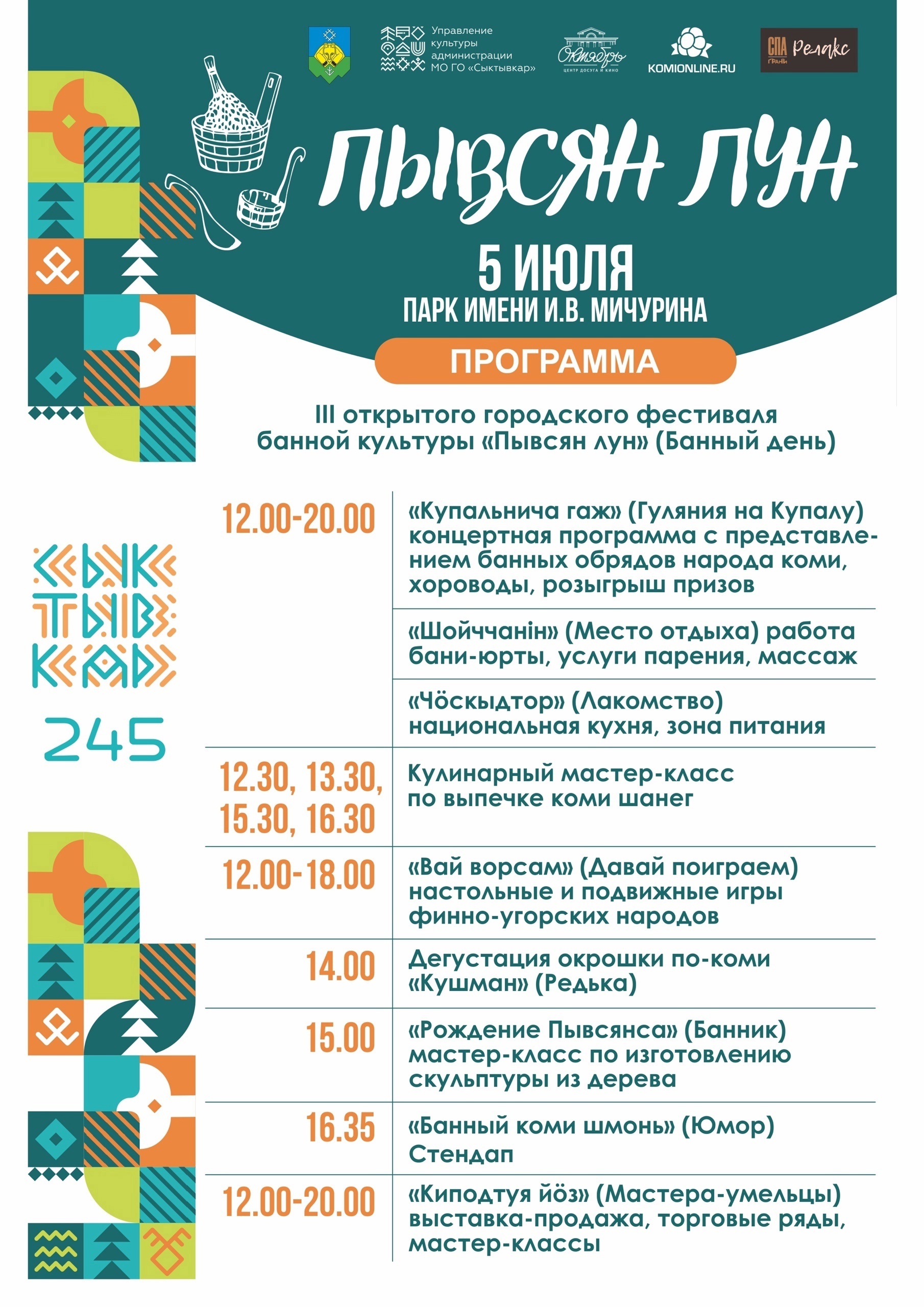 5 июля парк им. И.В. Мичурина станет главной площадкой праздника банных традиций. С полудня до 20 часов посетителей ожидает редкий шанс не только наблюдать, но и полностью погрузиться в древние обычаи, связанные с баней – неотъемлемой частью жителей Коми.