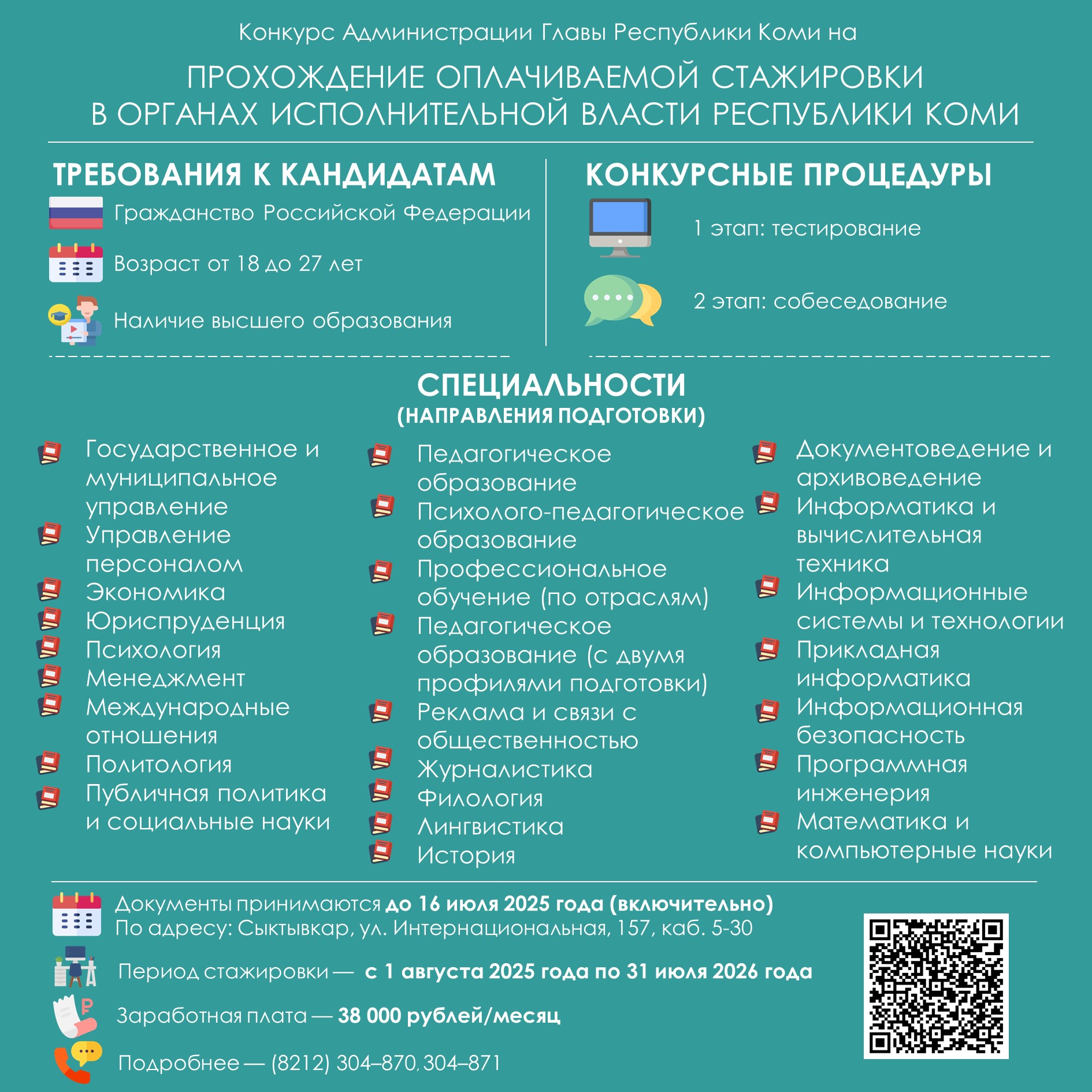 Документы принимаются до 16 июля 2025 года (включительно) по адресу: 167010, г. Сыктывкар, ул. Интернациональная, д. 157, Управление государственной гражданской службы Администрации Главы Республики Коми, каб. 5-30.