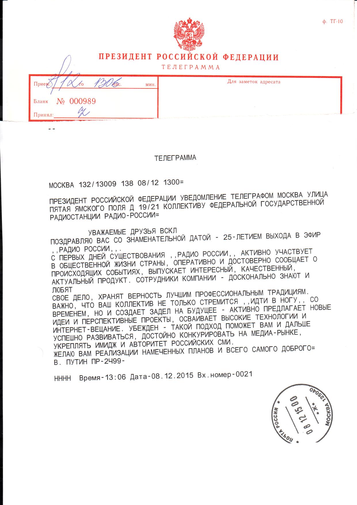 Поздравительная телеграмма президента РФ В.В.Путина
